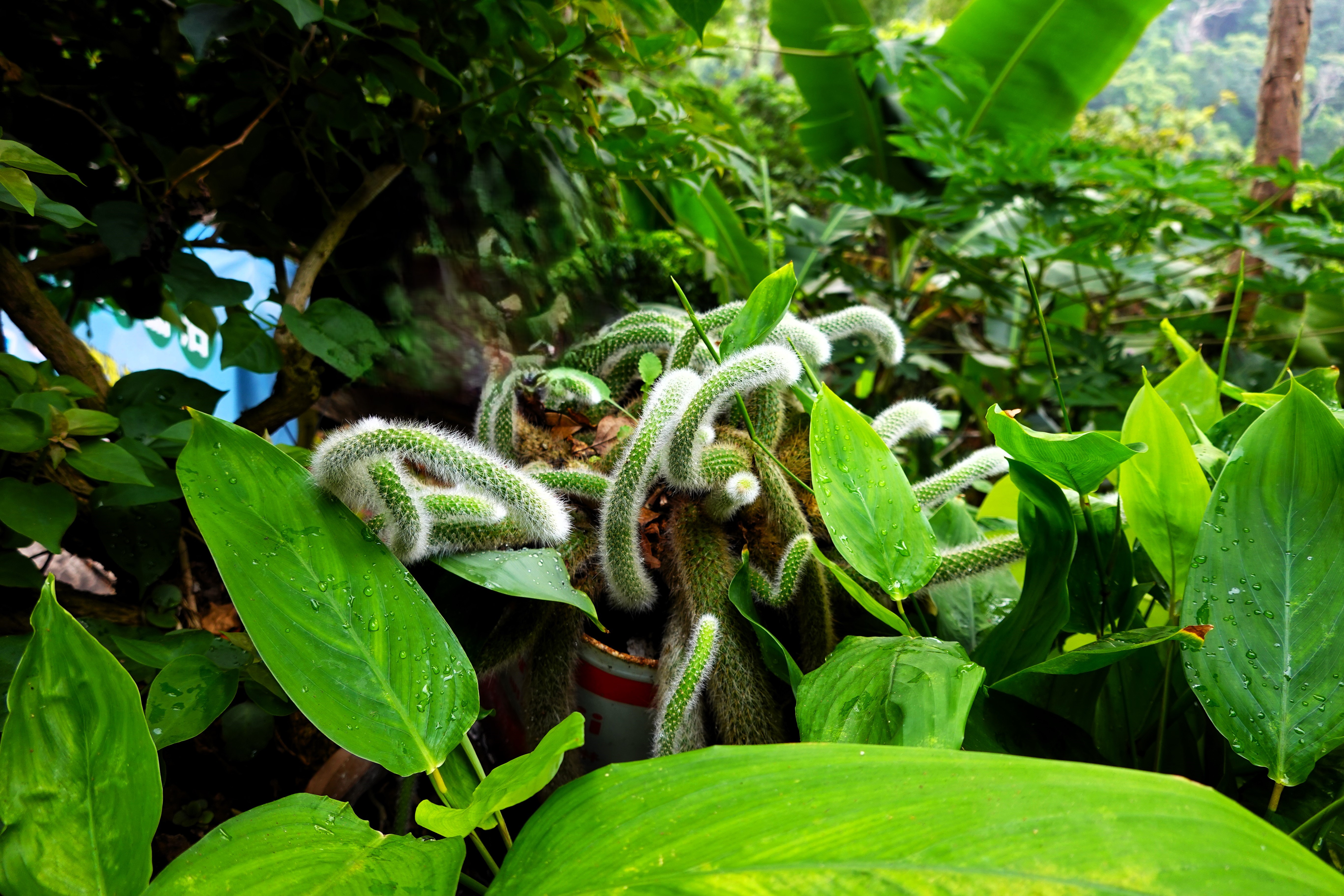 仙人掌科,多年生多肉植物。莖部細長,柔軟下垂,覆蓋著濃密的白色軟毛狀刺。夏季開花,花紅色,花冠直徑約3-4公分。 圖二:植株